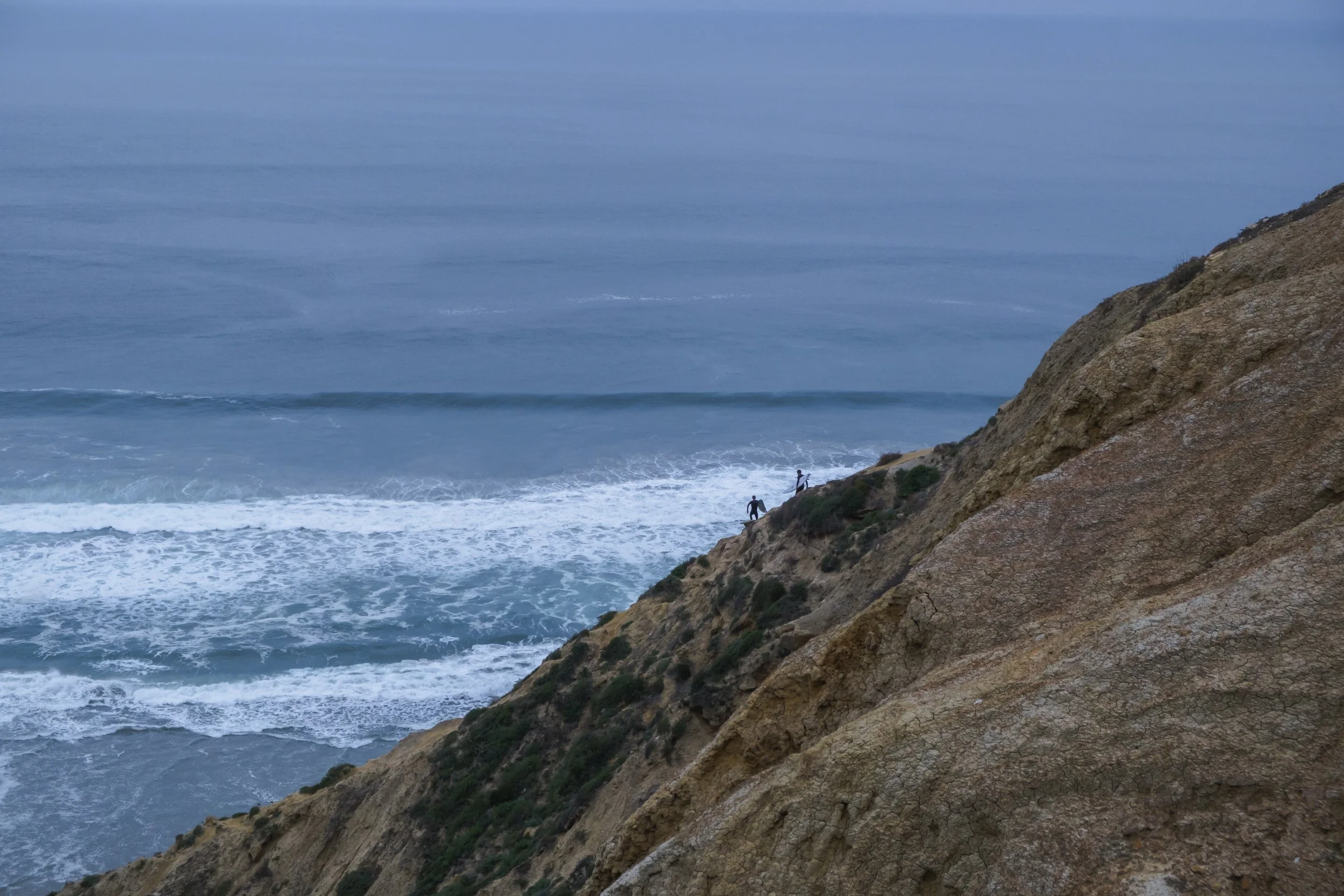As I arrived, the rain subsided, giving me enough time to walk down the trail for a few minutes. For a moment I saw some beautiful A-frames rolling in below, with only about 5 people out; then, the rain surged again, and as I ran to the car I slipped in the mud and caked myself in clay. Through the rain I saw dolphins jumping, but the downpour was too thick to snap a good image. I sat in the car for 30 minutes, waiting for signs that the rain would clear, debating with Erik over the phone if we should link up for a session or just get on with the day. By the time we hung up, the rain had slowed to a drizzle, and the wind blew in a whisper that I knew I had to follow. I stepped back onto the trail and a few minutes later, a coyote poked its head up from the bushes. For an extended moment we stared at each other. Birdsong filled the damp air, and light raindrops politely tapped a tune on the ground beneath our feet. This coyote and I stood on the cliff in silence, about 15 meters apart, staring at the ocean below, and back at each other, and at the emptiness around us.
