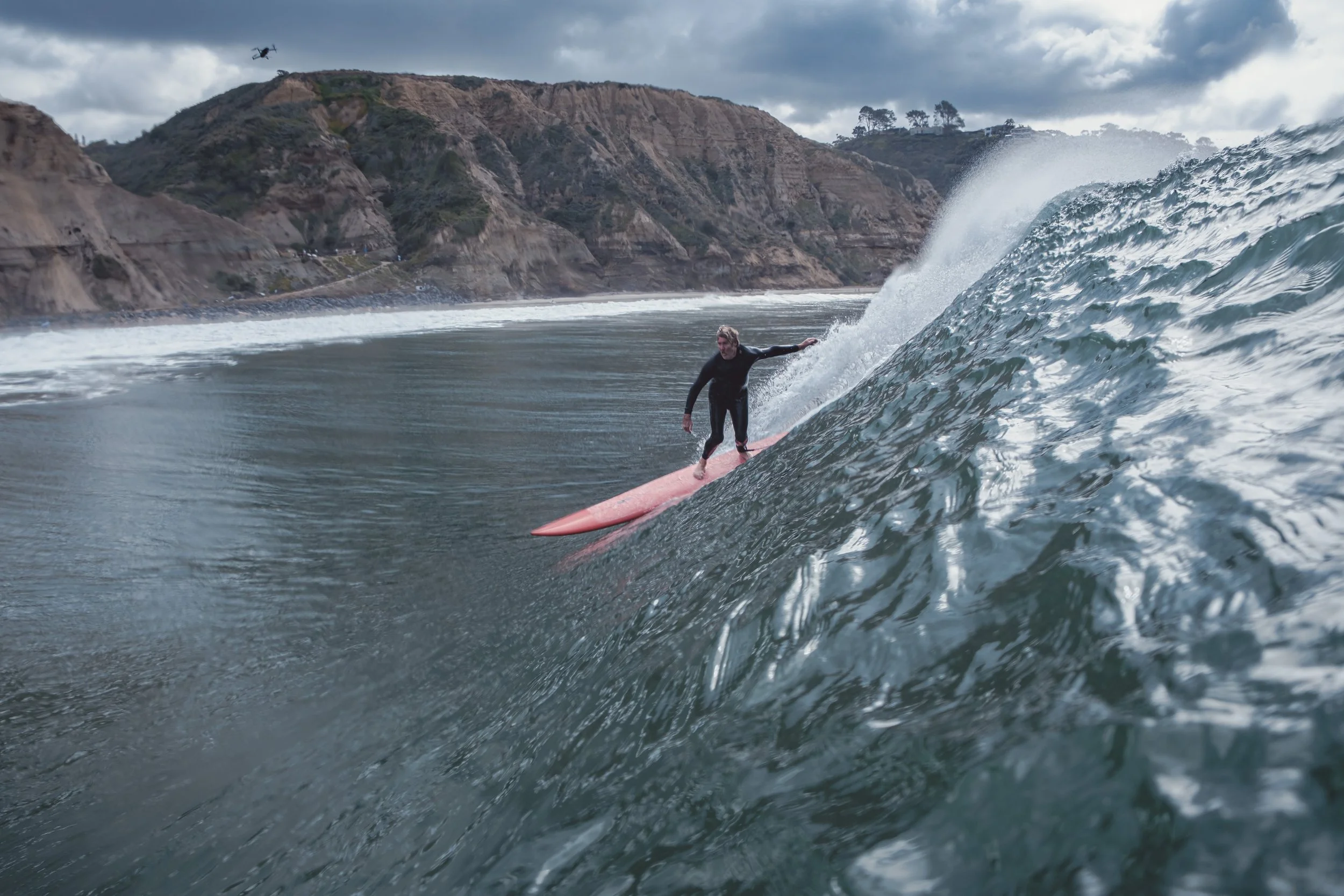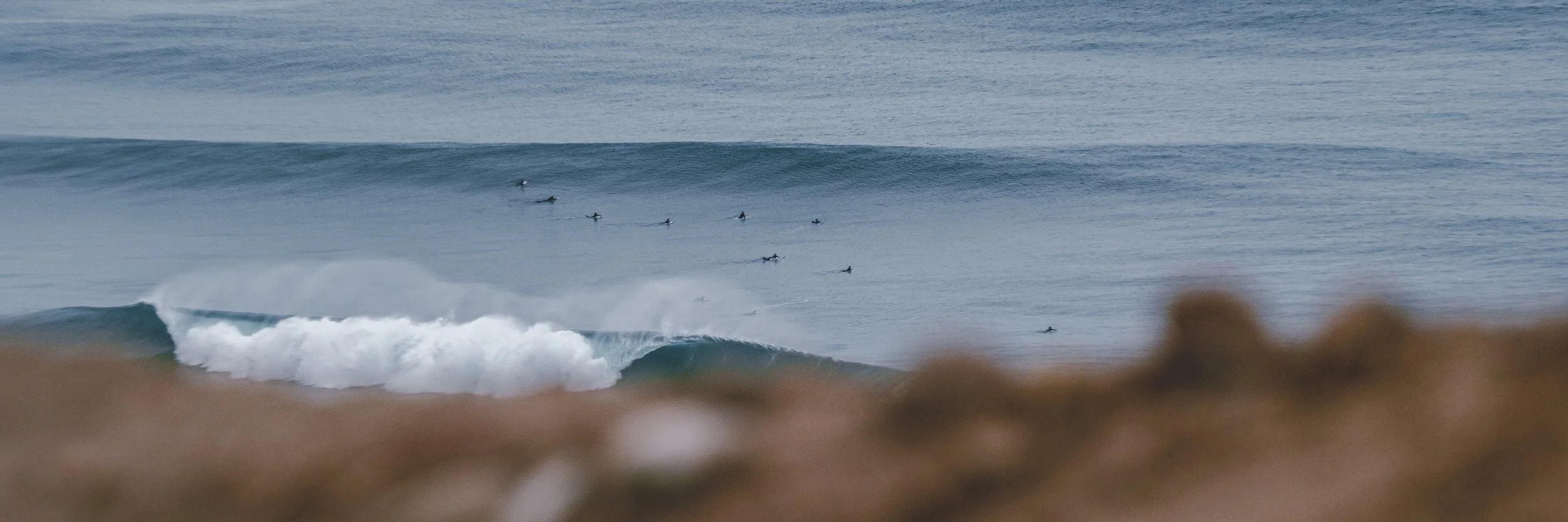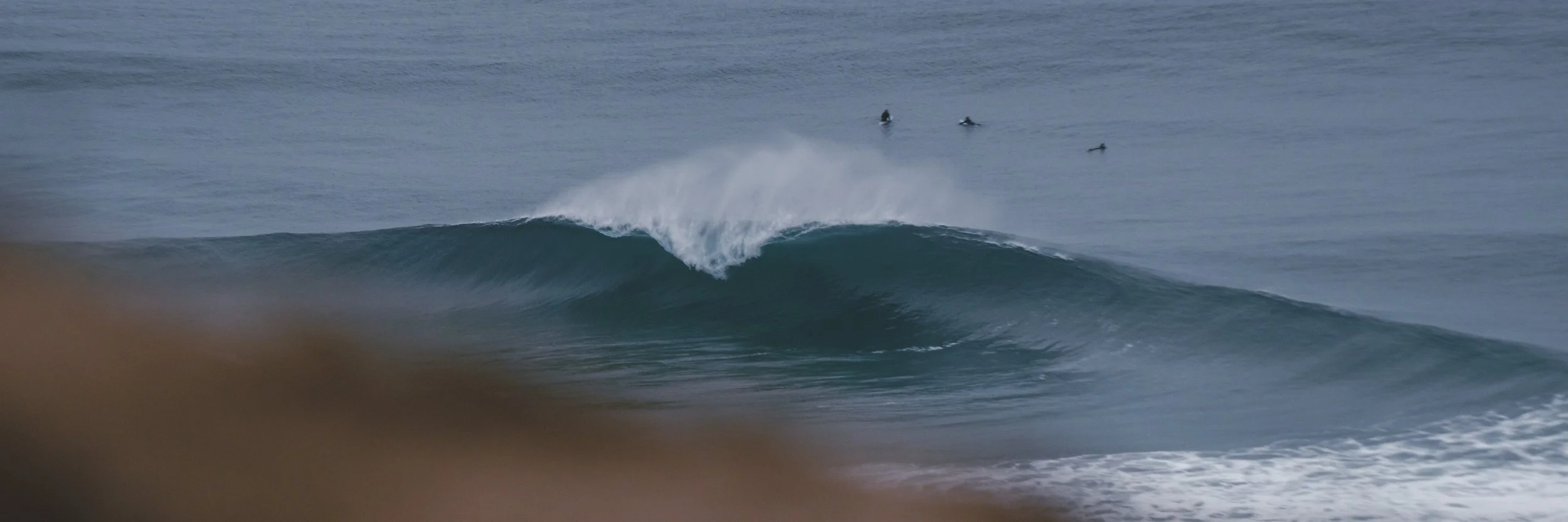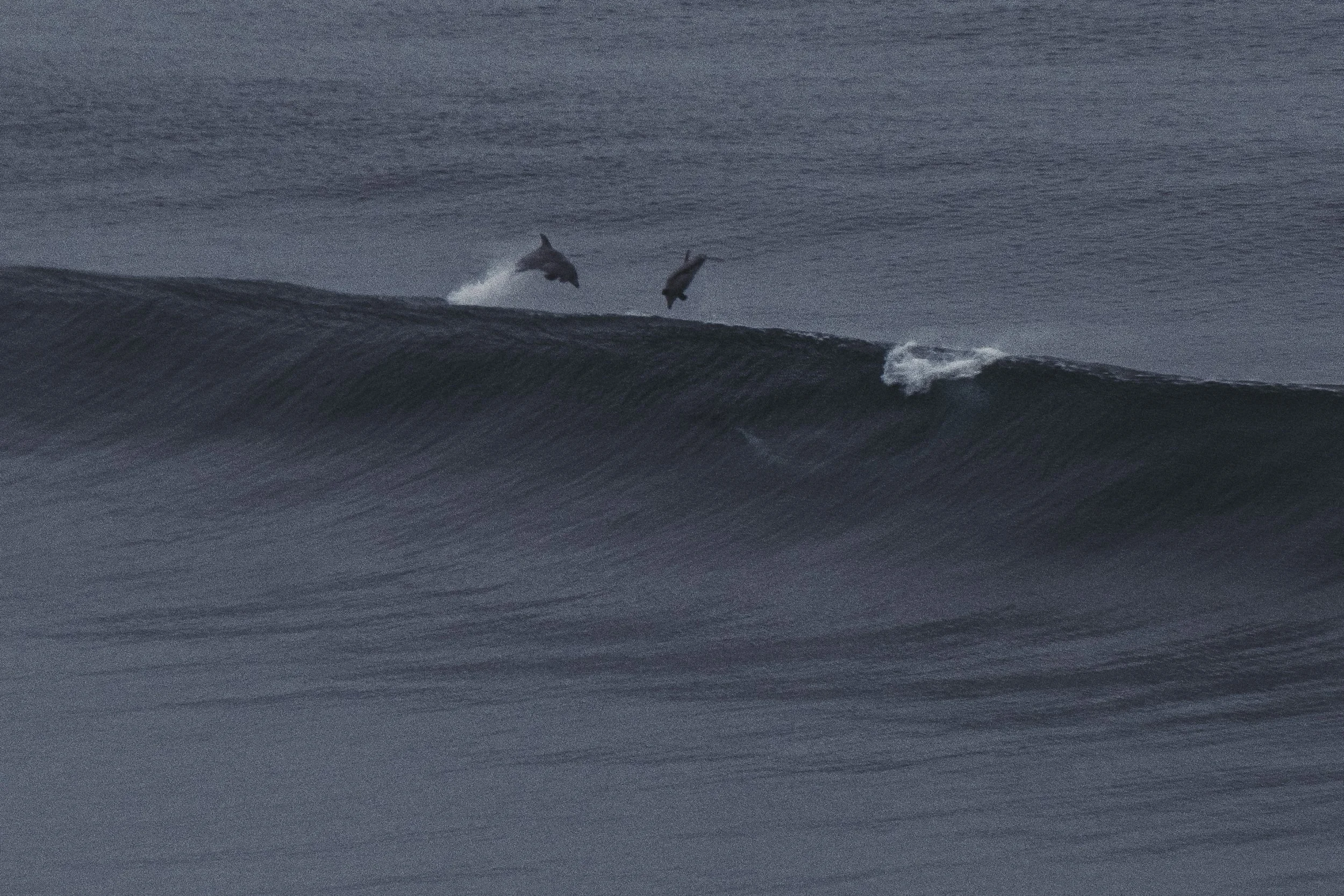 This is how the cliffs revealed themselves to me, in serenity and solitude. For the next two hours I didn’t see another person up there, and as offshore winds stabilized and the swell began to grow cleaner and more groomed and finally started to pulse, I saw more and more black-clad dots floating in the lineup. Wave after wave, it seemed, offered a clean and open barrel to whoever wanted it, and a pod of dolphins took every set, weaving beneath the surface in the heart of the wave before breaching out the back in glorious flight. I can’t help but wonder as I watch these amazing animals surf- are they wiser than we want to believe? Taking note over the years, this is one of my favorite parts about water photography, when a wave rolls in and I can ride the energy up its spine and launch out of the back as it breaks, flying for a moment before diving back under, an entirely fluid existence. As I stood there and watched from the cliffs, however, I could only live vicariously through the celebratory cetaceans below.