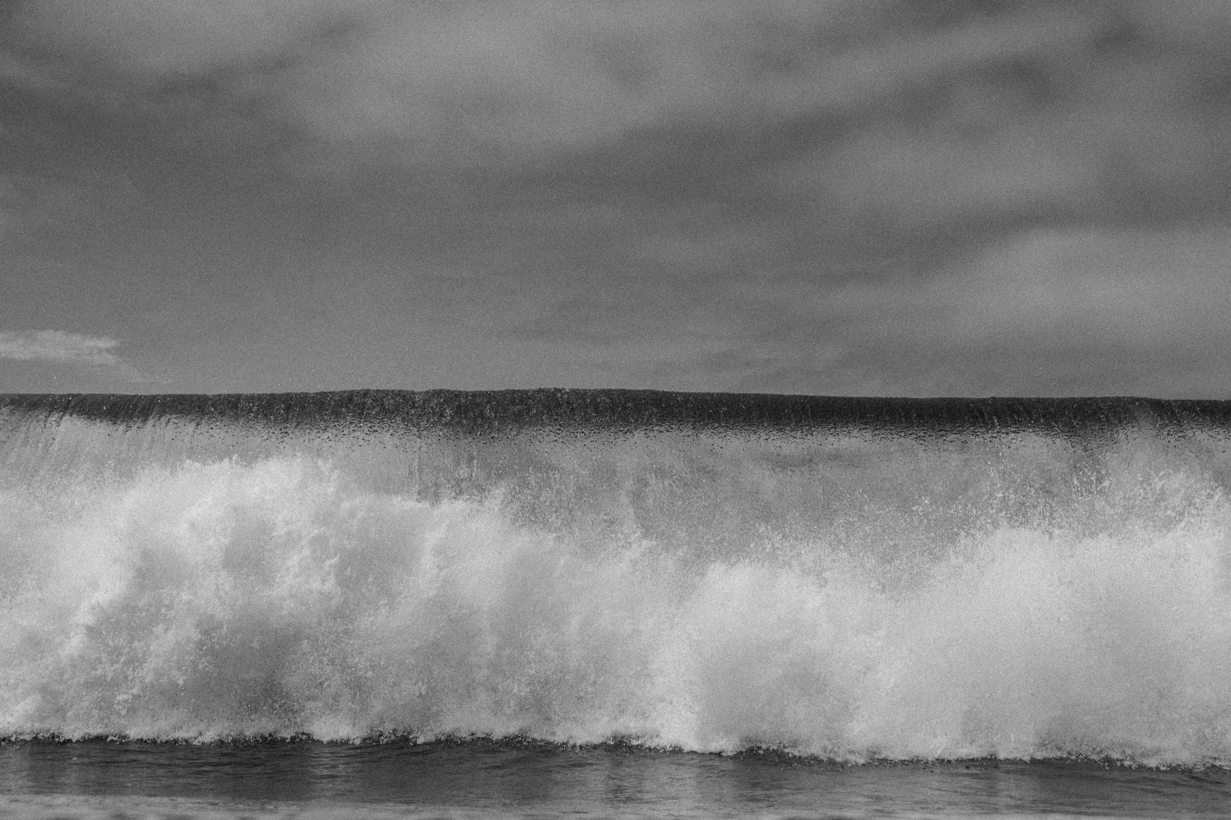 For my second time shooting in the water here (the first was so shallow that I didn’t even swim), I opted to play it safe, given the shifty nature of some of these peaks. Still, when I popped up from under one big but manageable wave, only to see everybody making a silent and hurried race towards the horizon, I knew what was in store. With only our heads floating above the surface, water photographers will use different measures to gauge the surrounding dynamics; when laughter in the lineup comes to an immediate halt and countless feet desperately churn water in their wake, it can only mean one thing.